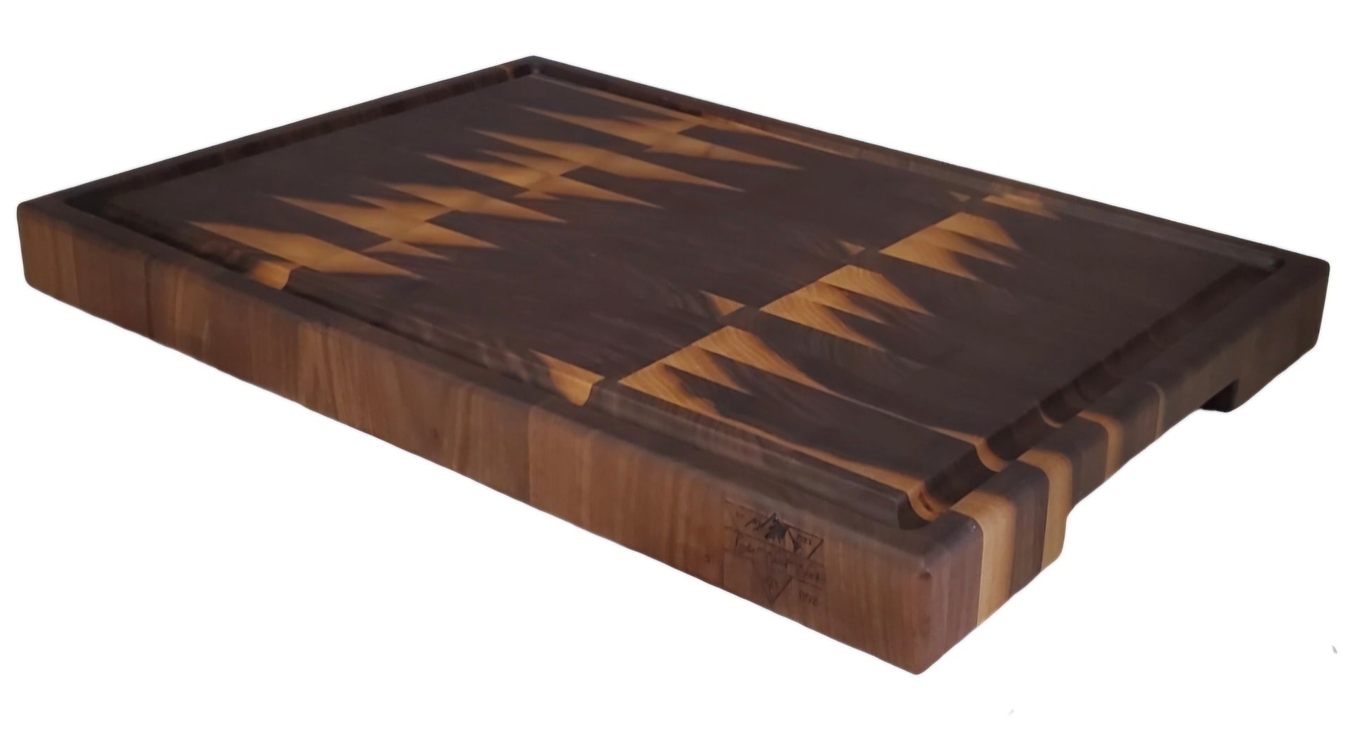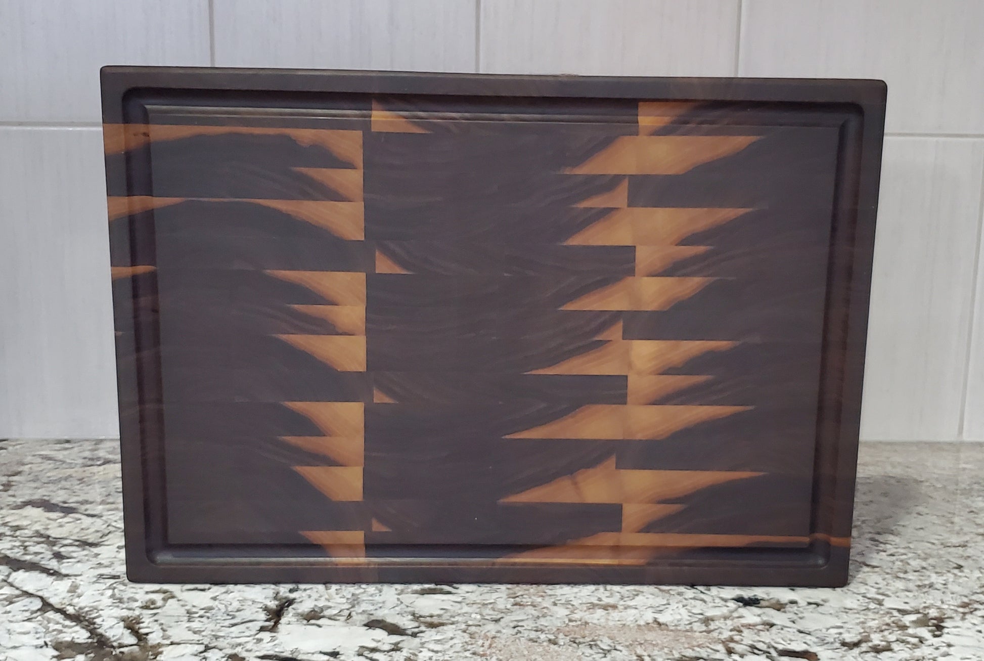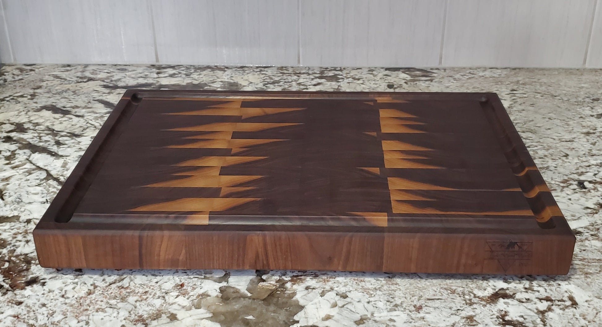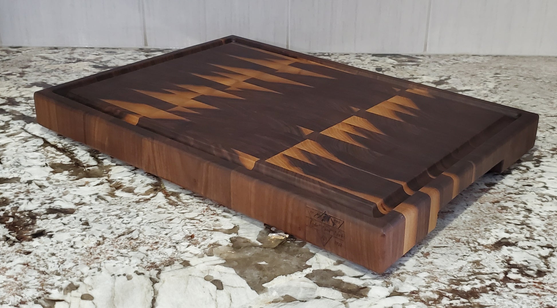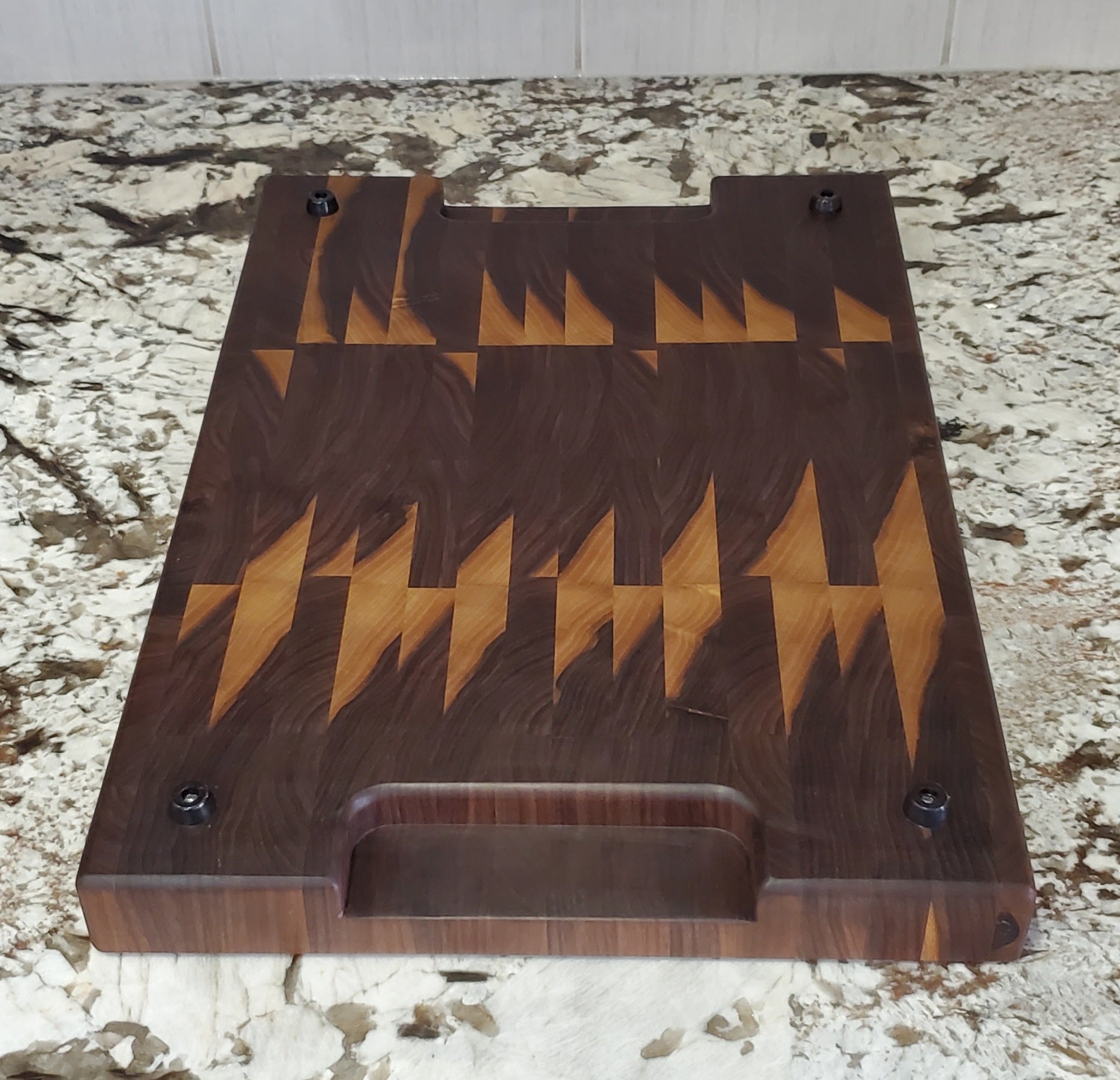 Hand Made solid Walnut cutting board features recessed handles, juice groove and non-slip rubber feet. Finished with food safe mineral oil and a beeswax conditioner. The end grain arrangement makes the work surface extremely smooth and durable. When cutting food the fibers absorb the impact of the blade making the board resistant to knife mark. It is also easier on the blade, keeping your knives sharper for longer. Dimensions 16.75"x11.5"x1.5" Weight 7.5lbs