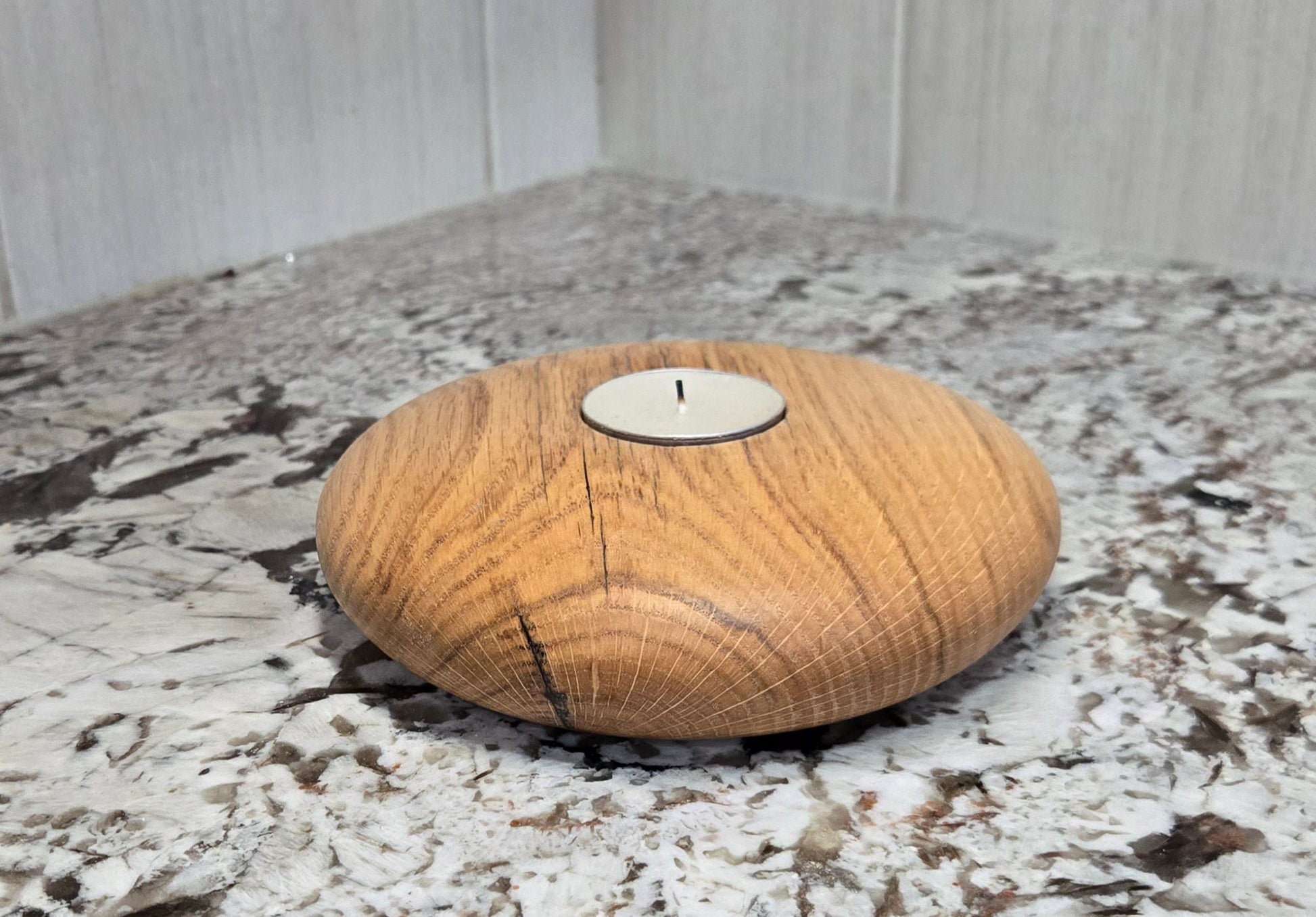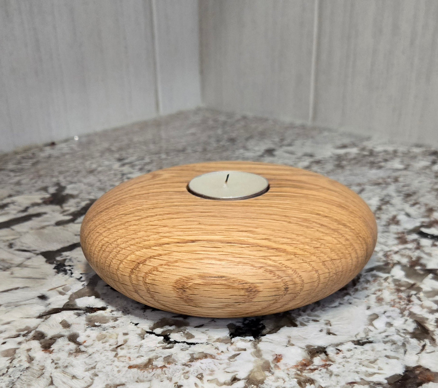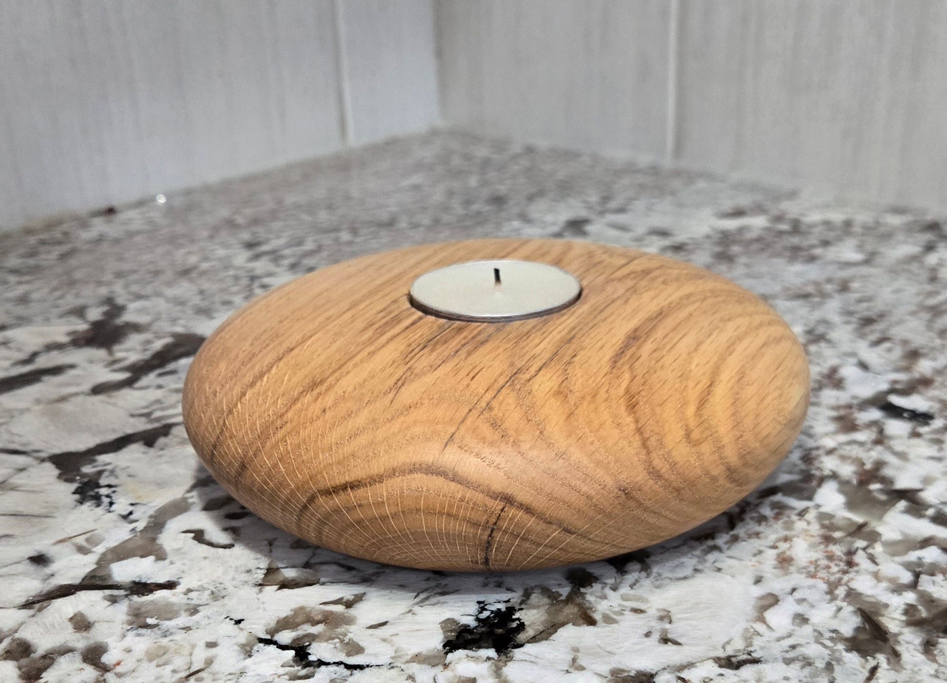 One of a kind hand turned solid Oak River Stone Tea Light Candle Holder. Finished with Danish Oil and Beeswax Polish.