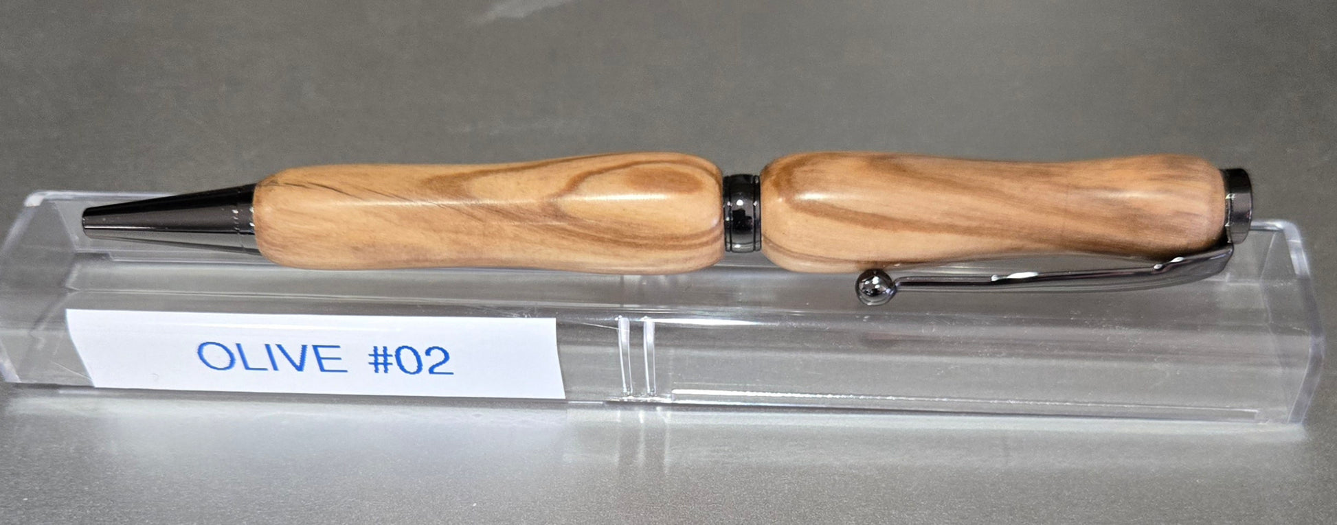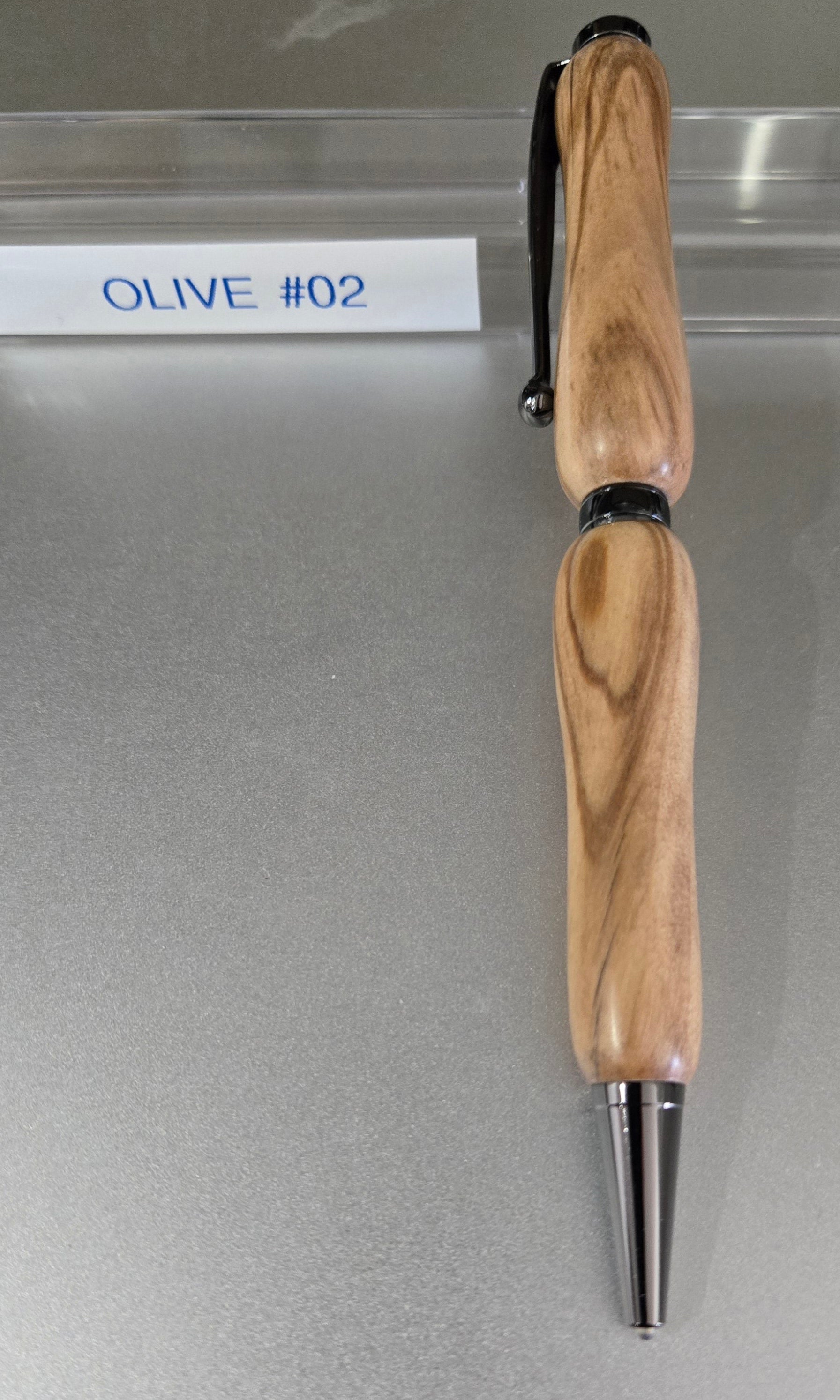 Slim Line Ball Point Twist Pen Hand Turned from Olive Wood with Gun Metal Hardware Finish.