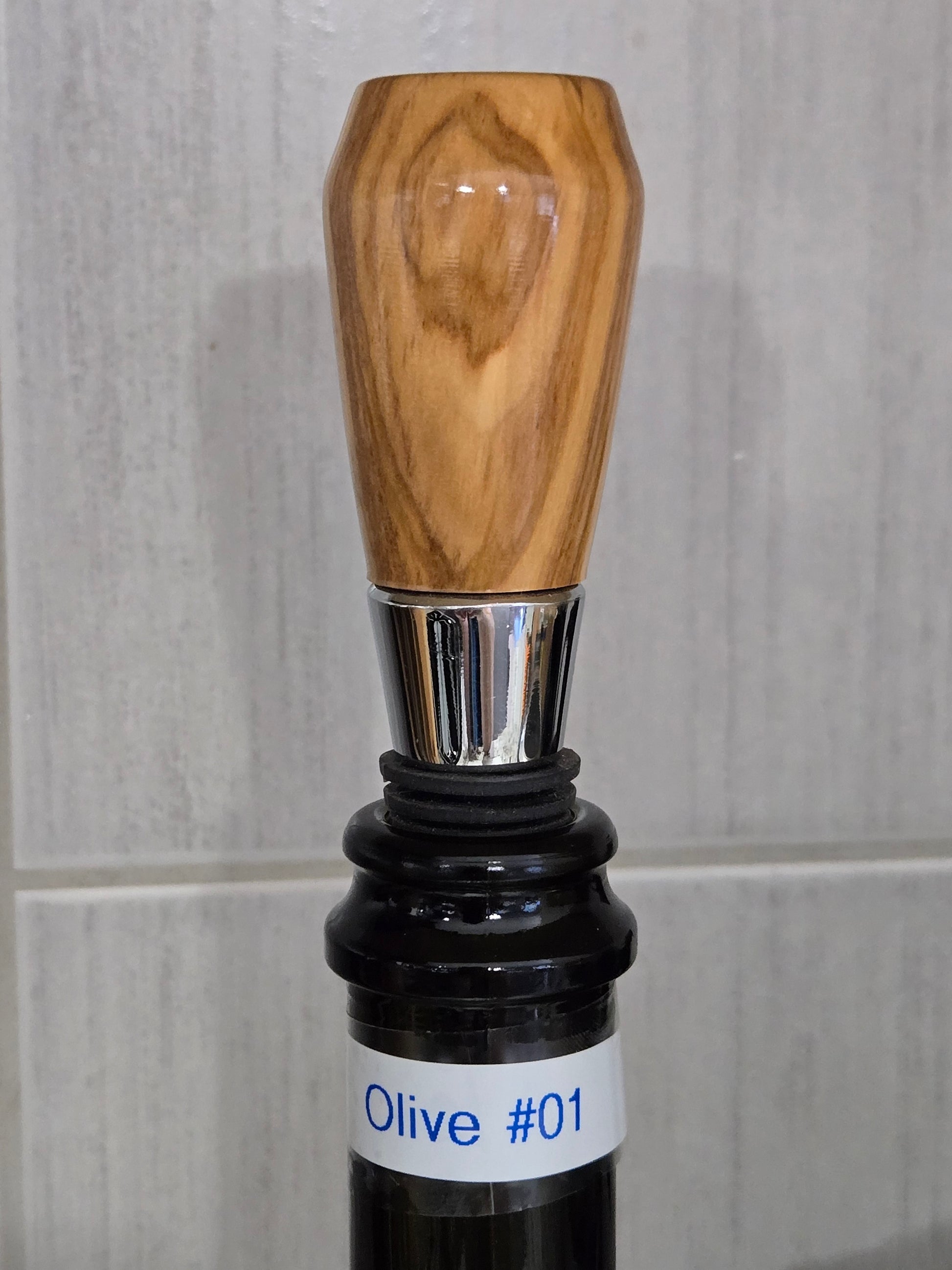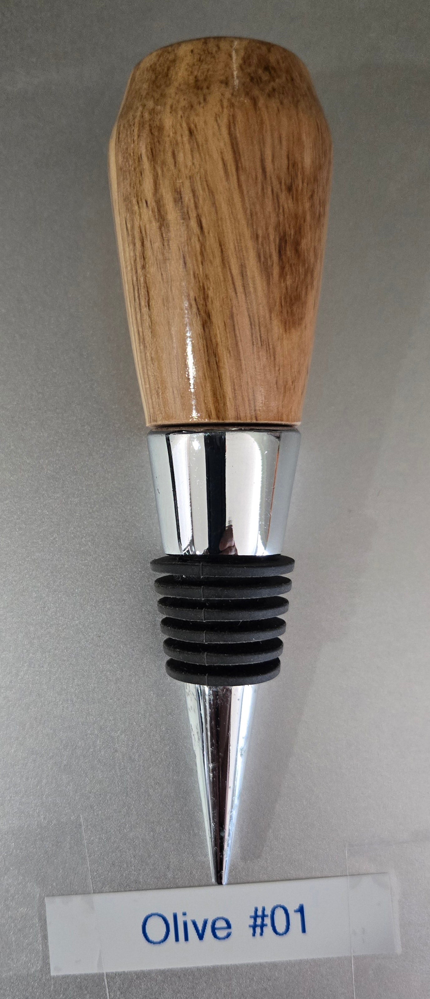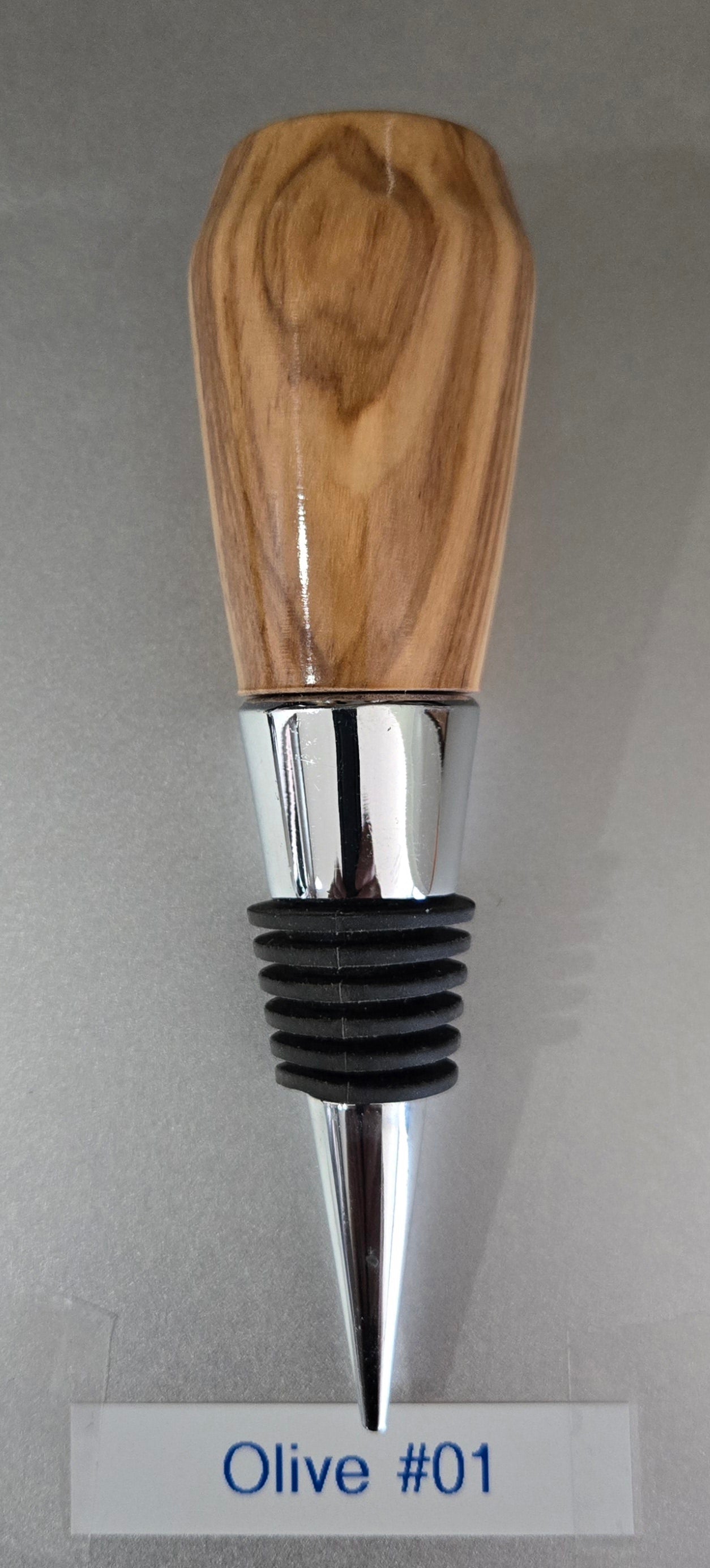 Hand Crafted Olive Wood Bottle Stopper. Works with corked wine and champagne bottles.