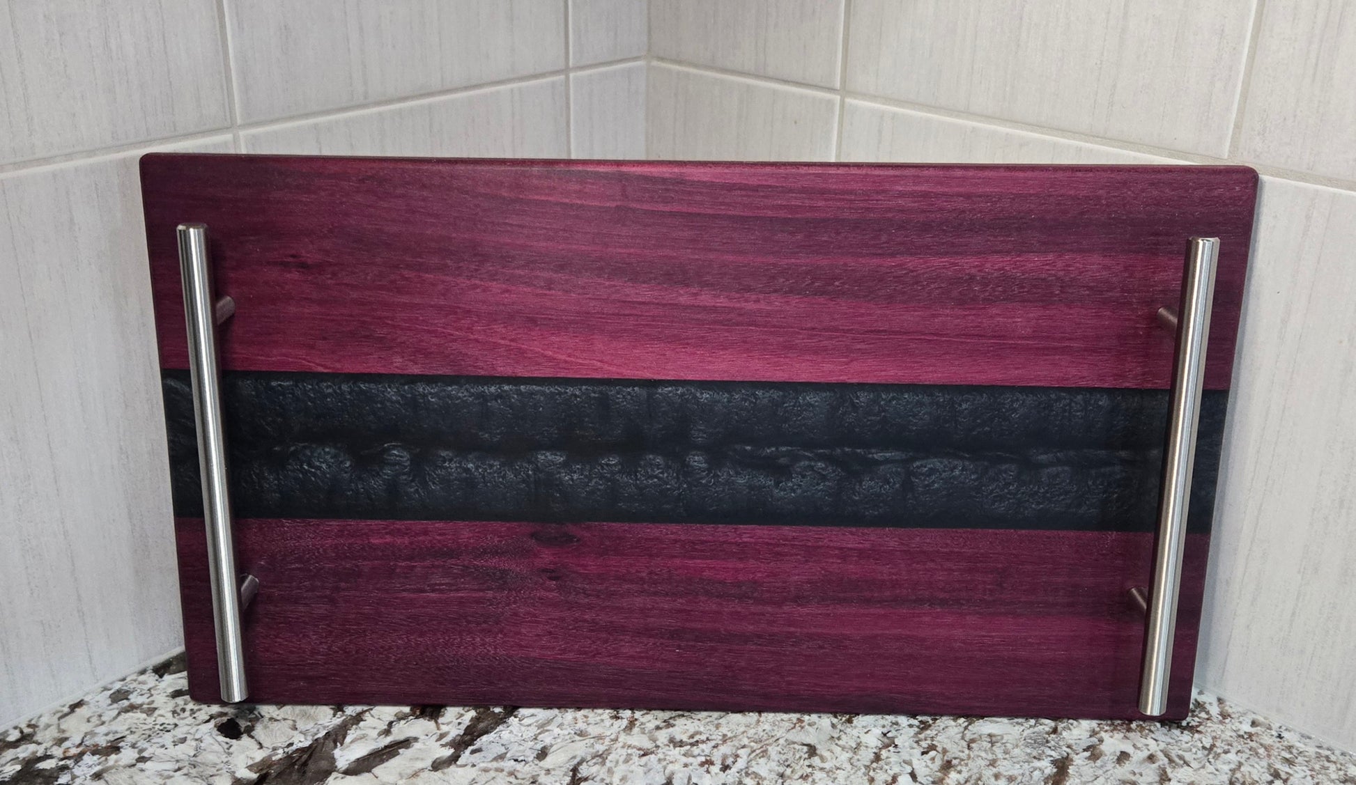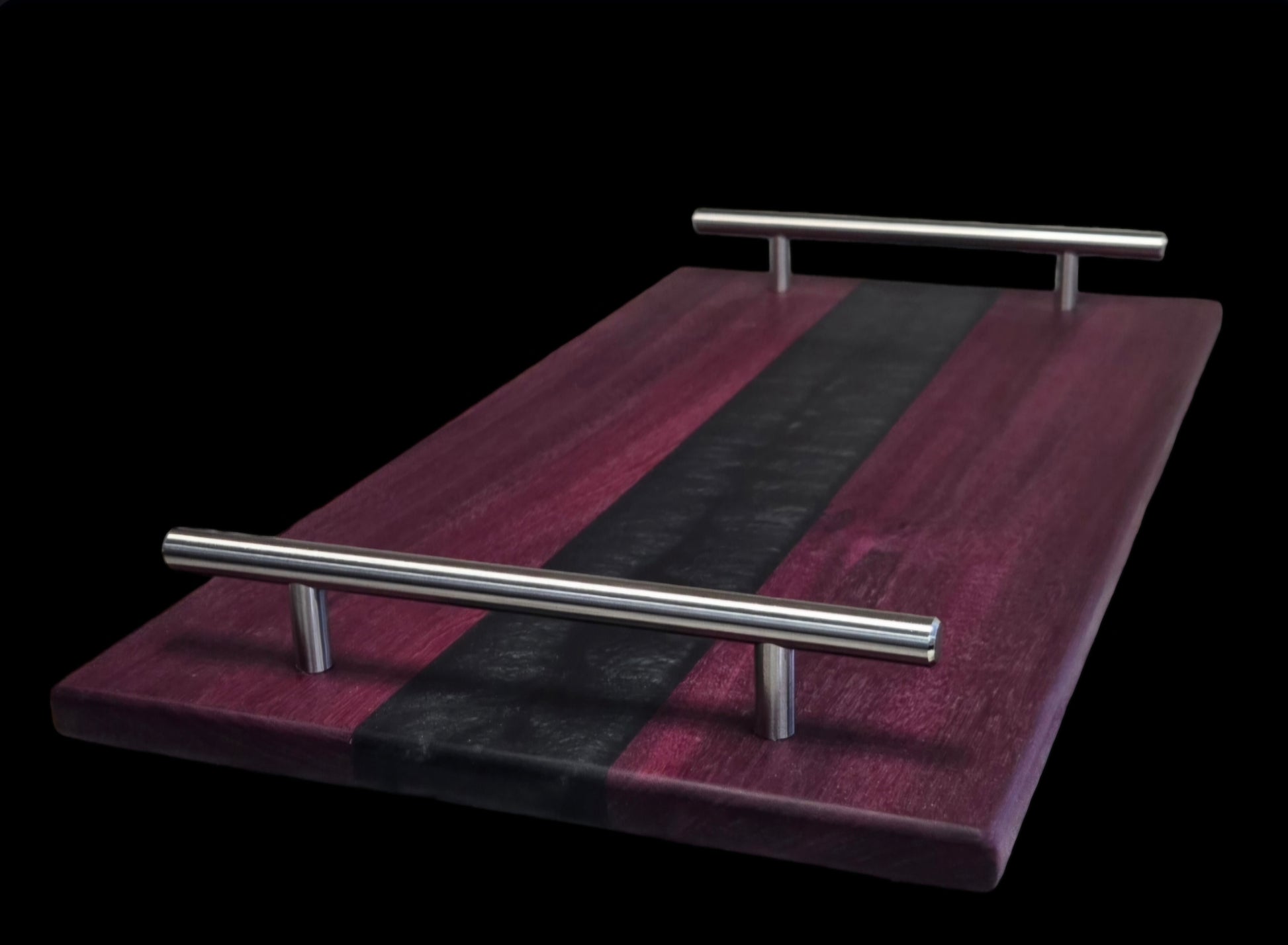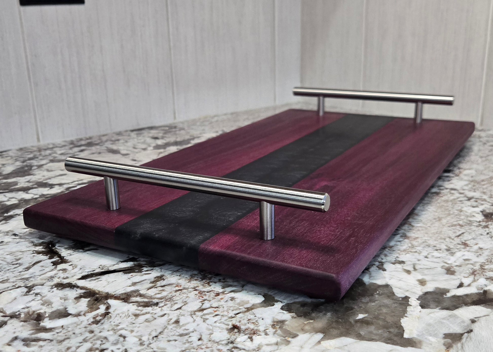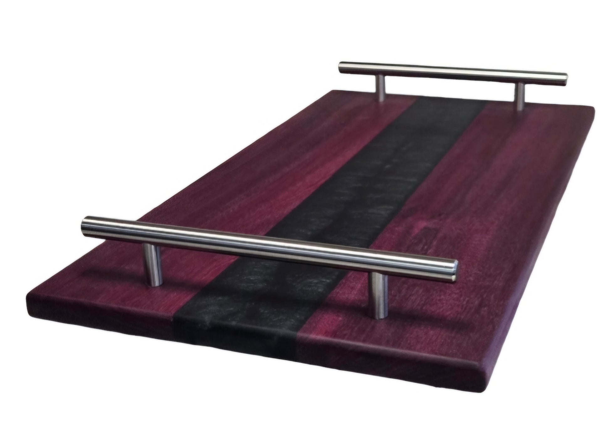 Hand Made Purple Heart and Epoxy Resin Serving Board with Non-Slip Rubber Feet and Brushed Nickle Handles. Finished with Food Grade Mineral Oil and a Bees Wax Conditioner.