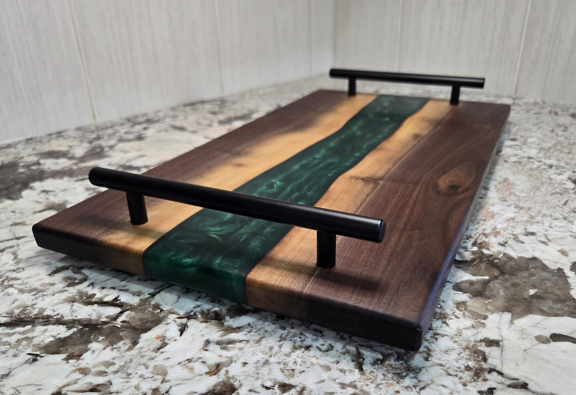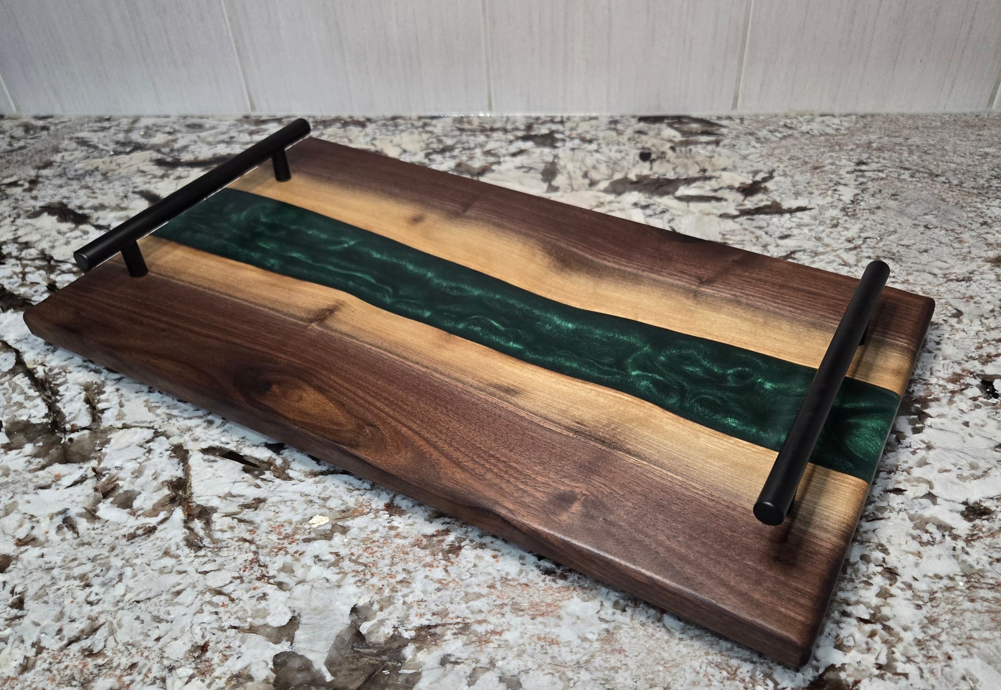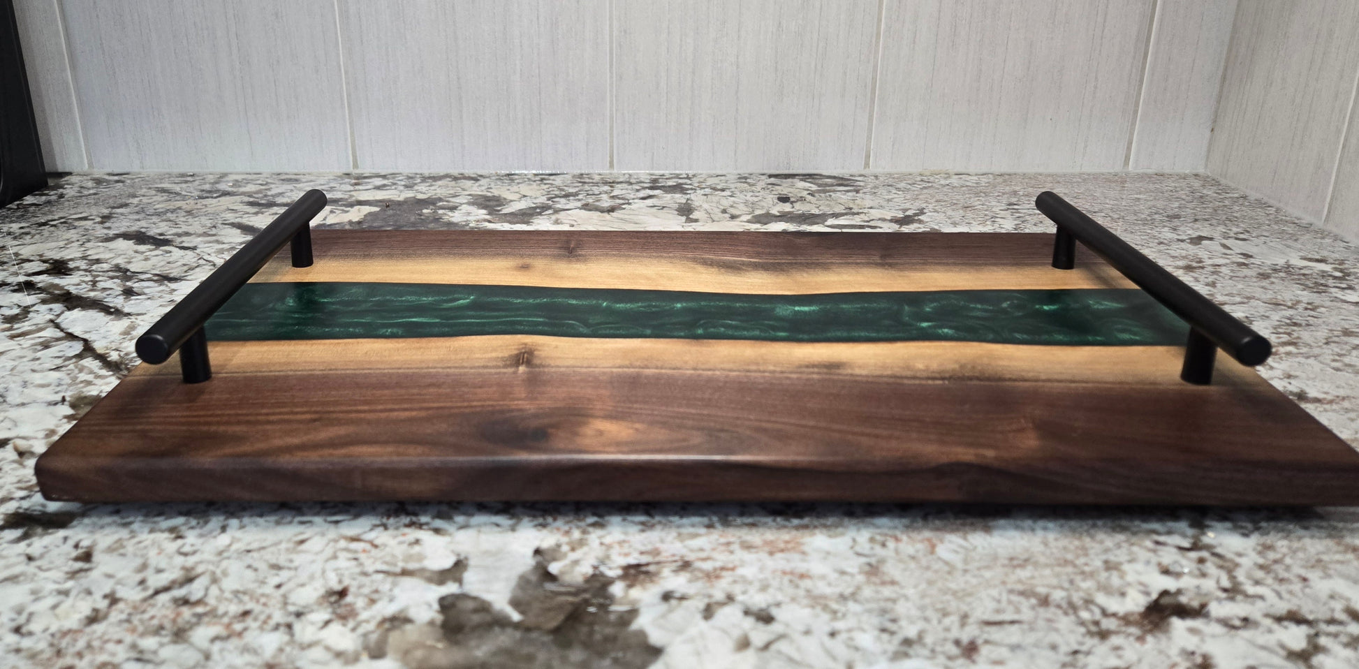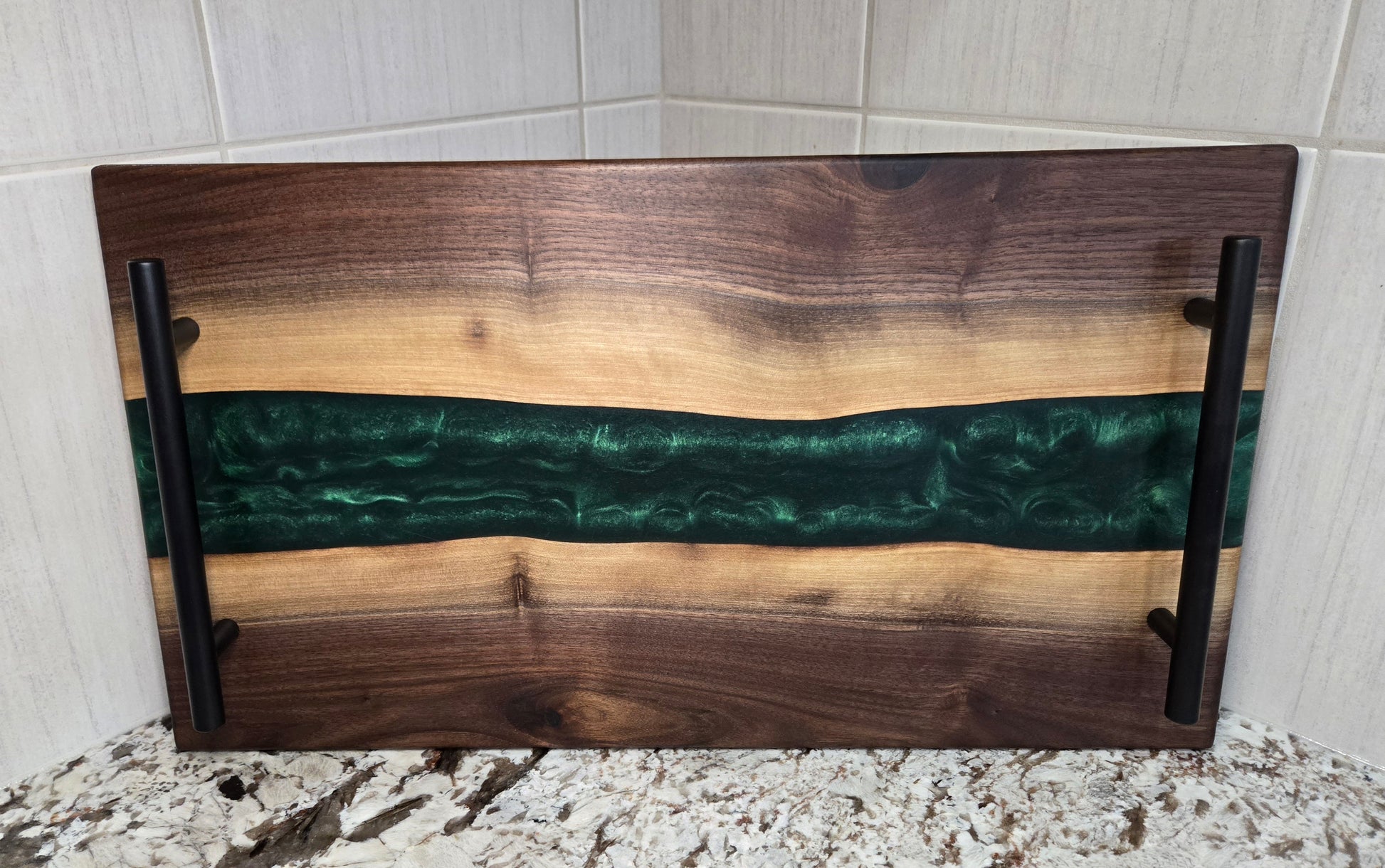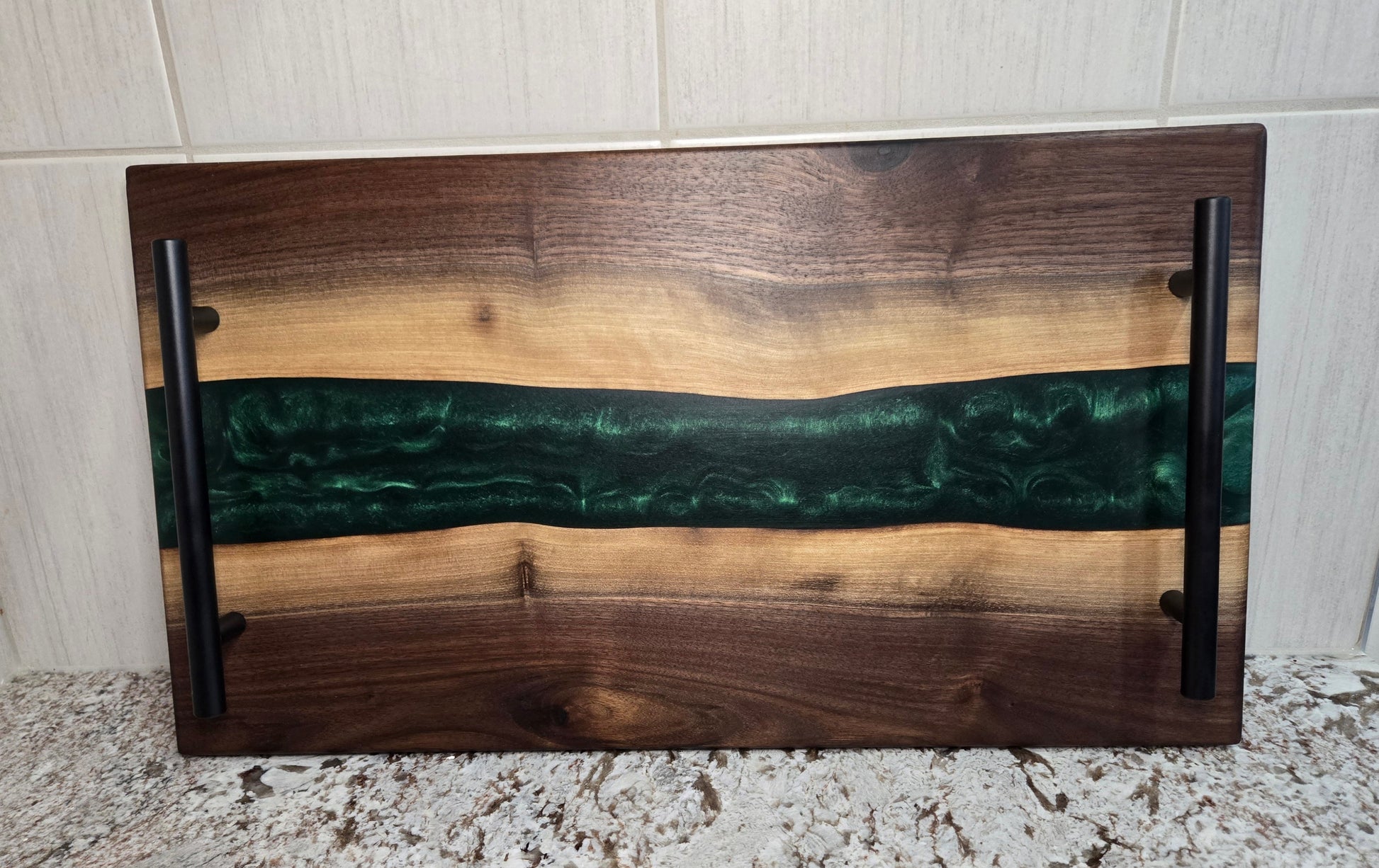Hand Made Live Edge Walnut and Epoxy Resin Serving Board with Non-Slip Rubber Feet and Black Handles. Finished with Food Grade Mineral Oil and a Bees Wax Conditioner.