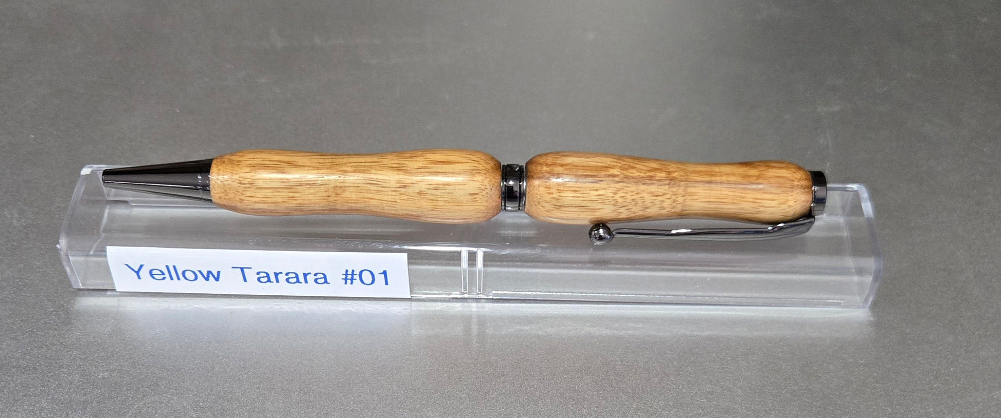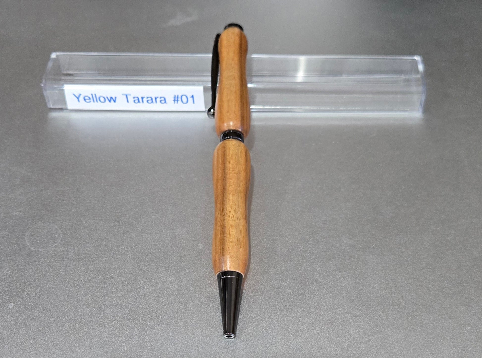 Slim Line Ball Point Twist Pen Hand Turned from Yellow Tarara Wood with Gun Metal Hardware Finish.